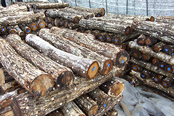 ビニールハウス内には大量の椎茸栽培用原木があります